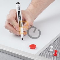 Stały nadruk: kratka o wymiarze 5x5cm, linia lub pięciolinia. Elegancka, rama wykonana z profilu aluminiowego w kolorze srebrnym, wykończona eleganckimi, popielatymi narożnikami. Dla rozmaru 170x100cm - tył tablicy wzmocniono blachą ocynkowaną, aby zapewnić jej stabilność, chroniąc przed wilgocią oraz wyginaniem.